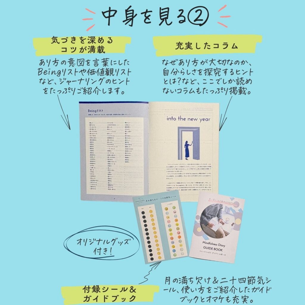 パカっと180度開くコデックス製本、日付なしでいつからでも始められる仕様など、今ここで、手で文字を書くというアナログな時間を通じて、マインドフルに立ち戻れる工夫が詰まっています。