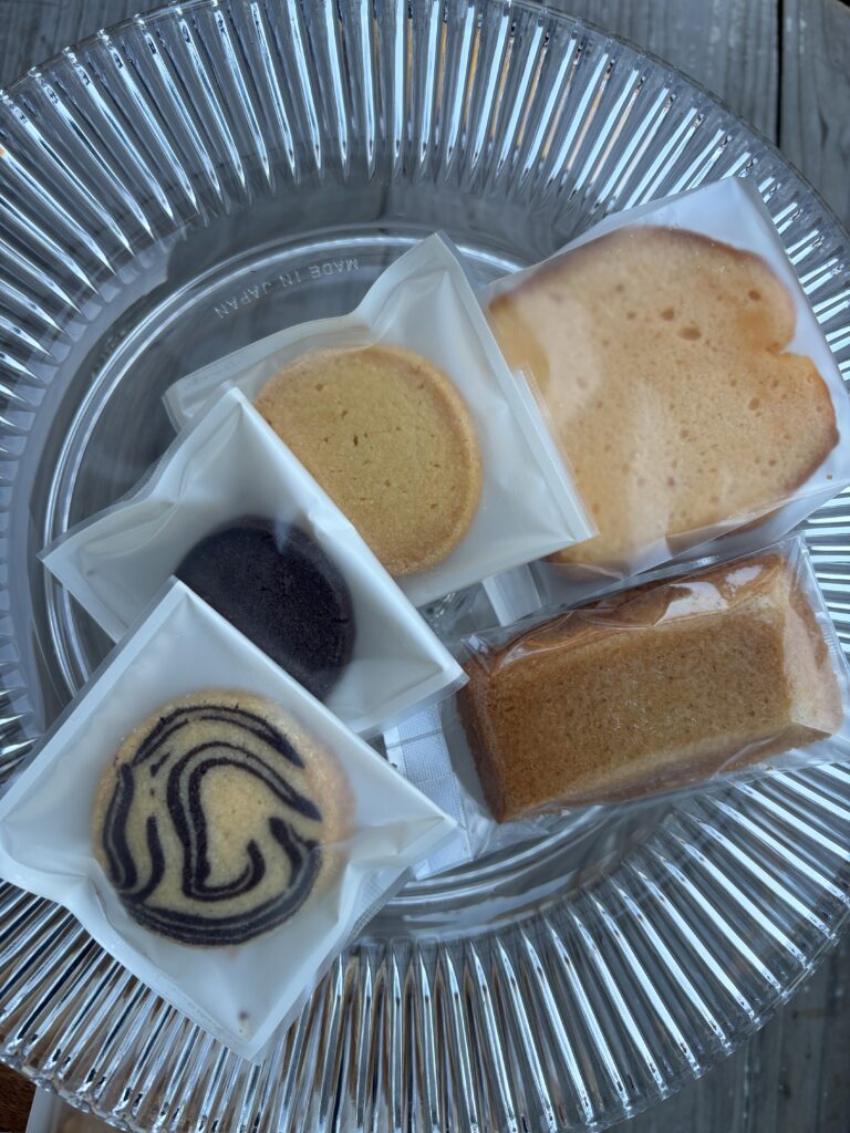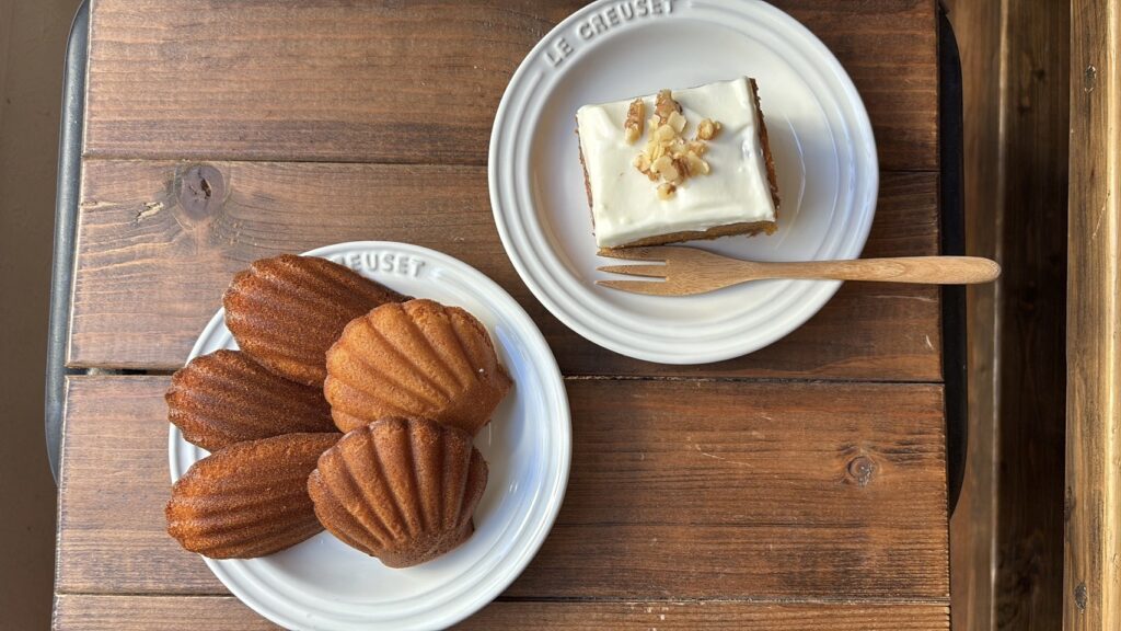 自慢のクッキーやお店の看板商品キャロットケーキをお持ちします。