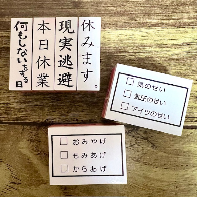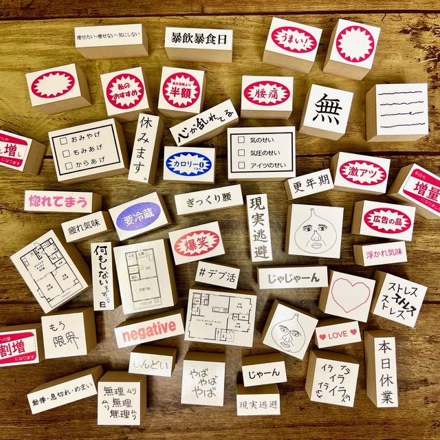 お迎え頂けたら嬉しいですが、見るだけでも楽しめる「クスっ」とするブースになっています。「地味にしんどい」「本日休業」「何もしないをする日」等、手帳に使える明るいネガティブなはんこを作っています。疲れ気味な方に、そっと寄り添える物を多数ご用意してお待ちしております。ぜひ休憩しに来てください。