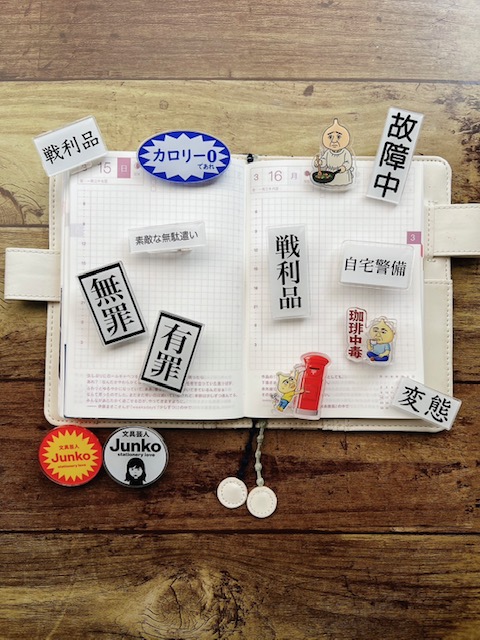 SNS映えのお手伝い、手帳に添えてアピールクリップ。人気の文字はんこも多数お持ちします。お買い上げのお客様には先着で「銀ギラシール(非売品)」プレゼント
